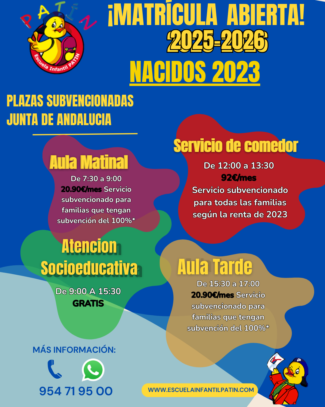 Éste curso, como novedad, nos trae la gratuidad de la plaza para alumnos nacidos en 2023 en el periodo de Atención socioeducativa. El resto de servicios están sujetos alas condiciones sociofamiliares para optar a las subvenciones de la Junta de Andalucía