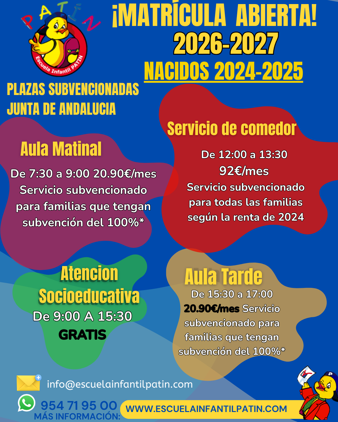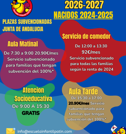 A partir del curso 2026-2027, la Junta de Andalucía financia el 100% del servicio de atención socioeducativa (el horario básico de 9:00 a 15:30) para todos los niños matriculados en los cursos de: